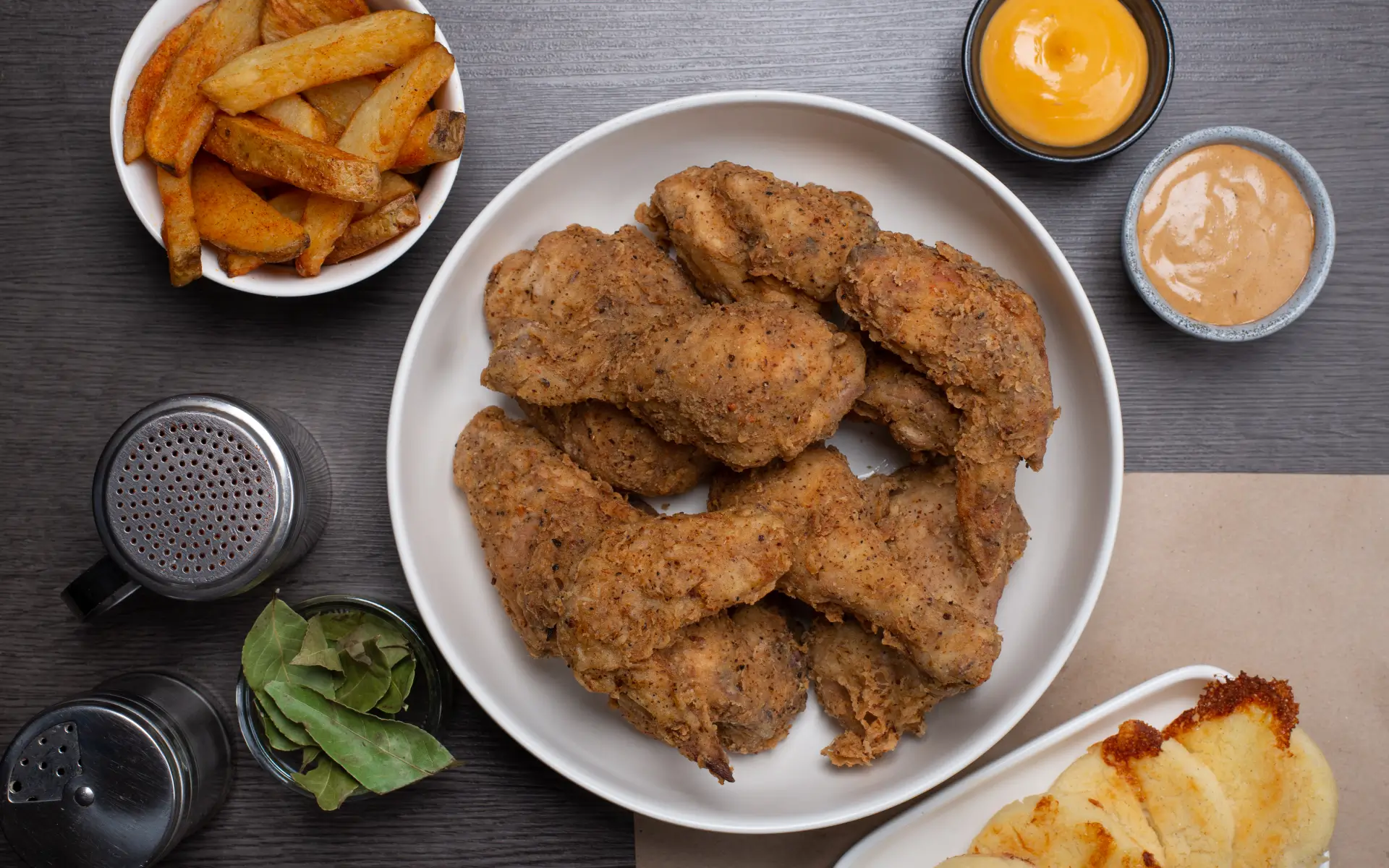 4 Presas de pollo adobados con chipotle, cilantro y especias, apanado con cobertura crocante mexicana, acompañado de 2 arepas con queso, papa rústica y salsas de la casa.